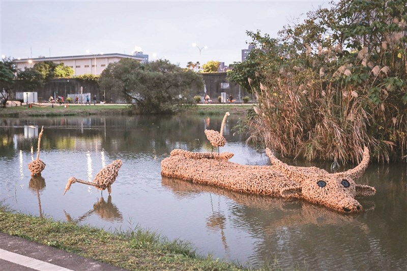 新北市高灘處於板橋新月橋下新海二期人工溼地,舉辦「新北溼地藝術季—川流堆疊」,由8組藝術家在體驗溼地後,用自然素材創作溼地相關藝術,共展出14件作品,圖為王昱翔作品〈牛汶水〉。藝術季8日開幕,現場有舞台表演及環境友善市集「裸裸實驗市」,8、9日及15、16日兩個周末還安排每天4場DIY手作坊,讓民眾體驗用自然素材製作蘆葦小掃帚、香蒲杯墊、植物拓印和可愛稻草人,歡迎民眾報名。圖/新北市高灘處提供