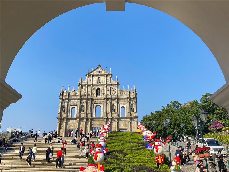 圖為澳門大三巴牌坊一帶今年元旦期間景象,為防堵境外疫情輸入,澳門宣布,9日零時起禁止大陸以外航班入境 。圖╱取自網路