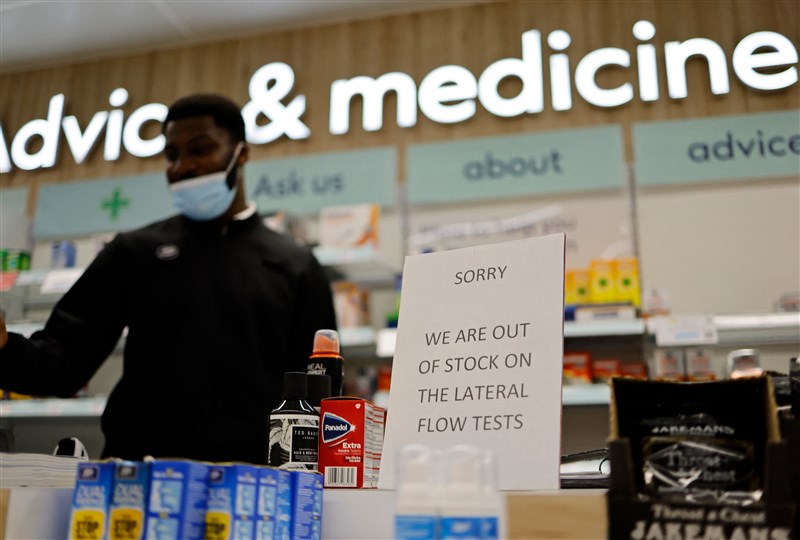 英國一間藥局公告,政府提供的側向流動測試劑缺貨。圖╱法新社