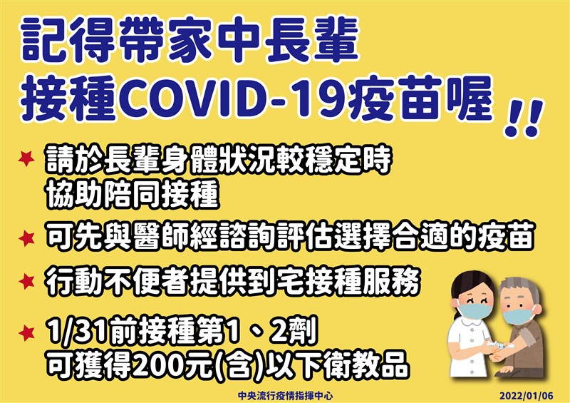 指揮中心表示,若為行動不便者,各地方政府衛生局亦設有到宅接種服務,有需求者可向各地方政府衛生局洽詢。另為鼓勵18歲以上尚未接種第1劑、第2劑新冠疫苗接種者盡速踴躍前往接種,於1月5日至1月31日前接種新冠疫苗者,可獲得地方政府發放之200元(含)以下衛教品,鼓勵民眾盡速接種,獲得保護力。