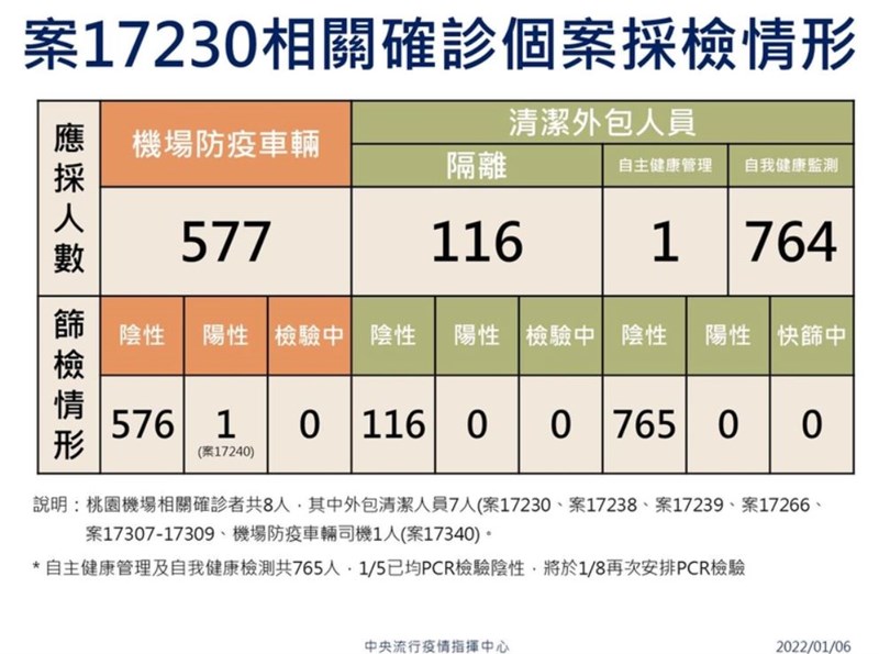 桃機群聚8確診4染Omicron 陳時中:「已進到本土」 |2022.01.06 語音朗讀 2683觀看次 字級 大 中 小 桃機群聚疫情延燒,目前累計8人確診,7例為清潔人員、1例防疫計程車司機,其中有4例染Omicron,指揮官陳時中不諱言,「Omicron已經進到本土」。圖╱季相儒 【本報台北訊】中央流行疫情指揮中心今(6)日公布,本土增3例、境外移入40例。本土為5日公布、但尚未取號的案17307-17309,皆為桃機清潔人員,目前桃機群聚累計8人,其中4人基因定序感染Omicron,指揮官陳時中也不諱言,「Omicron已經進到本土」。桃機群聚疫情延燒,目前累計8人確診,7例為清潔人員、1例防疫計程車司機,其中有4例染Omicron,分別是3名清潔員(案17230、案17238、案17239)和防疫計程車司機(案17240)。醫療應變組副組長羅一鈞表示,尚無法確認彼此是否同源,要等全序列結果出爐才能證實。今指揮中心公布5日晚間傳出3名大夜班清潔人員的確診案號,分別為案17307-17309,為本國籍女性,年齡介於50至60多歲,皆已接種2劑疫苗,Ct值分別是33.8、23.4、19.5。陳時中說,這3名大夜人員,案17307、案17308疫調較為清楚,一人曾與案17238消毒的場域洗手間是同一個,另外一位則與案17239白天一起教育訓練,有比較長時間接觸。案17309目前還不清楚,工作場域沒有固定,是巡迴性的。陳時中表示,現在案17307相對Ct值較高,症狀看起來比較早,但個案是多點進來、多條線,現在狀況比較複雜,等更清楚些再報告,現在猜測幾波傳染意義不大。圖/中央社桃機這波疫情持續燃燒,陳時中5日才對外表示,「交通車搭乘是一個蘿蔔一個坑」,後來經調查卻發現,確診清潔員所搭乘的交通車有路線混搭等情形,新增3例個案「非同班交通車人員」,被外界指向感染矛頭是交通車混搭而交叉感染。陳時中說:「已知降級後防疫相關措施鬆懈了,現由前進指揮所掌握細節才更正,但二級警戒後沒有罰則,不會對單位進行處分,但希望要改善。」目前指揮中心要求人員全部列入集中隔離,陳時中表示,原先是以同台交通車群聚作為主要的關切點,但是近來多了幾位職場人員,沒有直接接觸到個案,要等資訊更清楚才能判定。指揮中心5日晚間公布,桃機群聚再增3名確診者,皆為擴大採檢的大夜班清潔員,共93人全數送集中檢疫所隔離。圖/中央社陳時中表示,3人中有2位坐固定路線,但空調感染並非不可能,但最重要的還是在接觸,有要求所有交通車都要梅花座且固定坐位,且要有負責小隊長負責健康監測及座位安排,若要變換搭乘路線必須報准。採檢進度方面,陳時中說,目前8名確診個案第一圈接觸者都陰性,家庭接觸者全陰性,這算是比較好的情況;至於在社區裡的接觸者,案17309仍在進行疫調匡列接觸者,案17239的歌友會接觸者已知15人陰性、1人檢驗中。陳時中指出,疫調團隊另匡列577人須擴大採檢,目前全數檢驗完畢,其中576人陰性,案17240是唯一的陽性個案,未來會持續針對機場人員進行定期PCR採檢。圖/指揮中心 前一篇文章 防疫旅館又見群聚 2房客染Omicron1例改列本土 下一篇文章 不排除已有數波感染! 桃機8人皆打完2劑疫苗屬輕症 熱門新聞 01MLB太空人打敗洛磯 鄧愷威中繼成功2026.04.1602佛光大佛供奉法華塔與《法華經》信仰意涵2026.04.1203蔬食技巧 不吃肉也能補足蛋白質2026.04.1304澱粉食物 口感變化有祕訣2026.04.1305法全票通過 掠奪文物歸還中國2026.04.1706【深深思念】把悲傷 穿在身上2026.04.1407《浩瀚星雲》大阪海外首演 轟動滿座 2026.04.1408佛光山線上佛學院開學 逾百學員雲端共學2026.04.1509預備檀講師研習 傳播人間佛教正能量2026.04.1410高市國稅局長訪佛光山 認識人間佛教2026.04.13 訂閱電子報 台北市 天氣預報 台灣一週天氣預報 相關報導 美議員籲立院 通過國防預算恢復兩岸航點 陸委會:無迫切必要跨域載具AI智慧安全系統 亮相3展聯合開幕 聚焦電動、氫能車賴總統4月22日出訪史瓦帝尼大型建案強制裝光電 藍提案喊卡