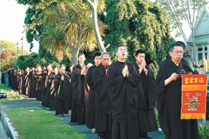 紐西蘭南島佛光山元旦首次舉辦淨心朝山活動,近百位信眾一早從Harakeke Street一路朝山至道場,早齋後,還出坡大掃除,將道場裡裡外外、打掃整齊乾淨,迎接新的一年。(人間社記者陳惠君攝)