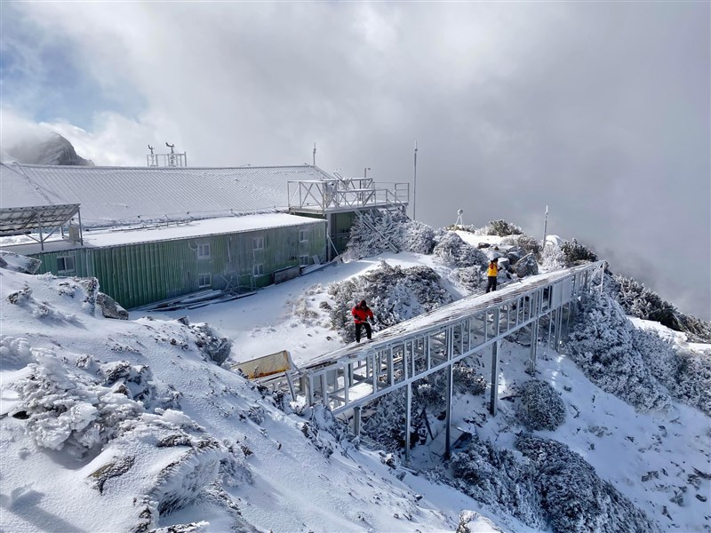 【本報台北訊】玉山昨天降雪,截至今天(8日)積雪達2公分。中央氣象局長鄭明典在臉書公布玉山氣象站工作人員的照片,為玉山氣象站人員為光電板除雪的工作情形。他說,昨天有凍雨,凍雨直接結冰在光電板上,「同事說超難刮,但還是要除雪」。