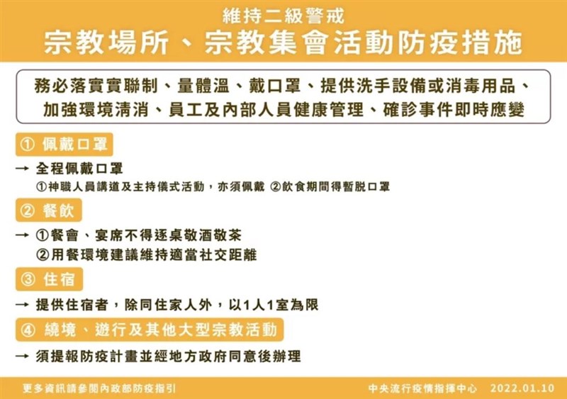 【本報台北訊】中央流行疫情指揮中心昨(9)日宣布口罩措施加嚴,今再針對宗教活動祭出「四大防疫措施」,宗教活動全程戴口罩、餐會不能逐桌敬茶酒、香客大樓除了同住家人以一人一室為限、繞境活動必須要事前申請。副指揮官陳宗彥表示,因應春節的到來,呼籲地方政府與宗教團體配合。