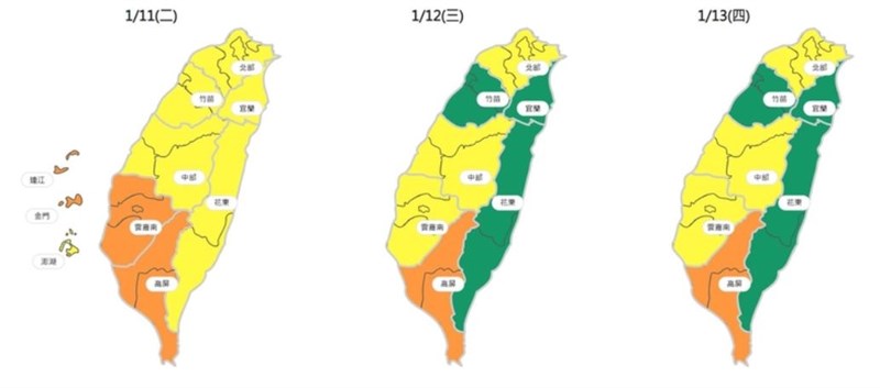 13日仍受大陸冷氣團影響,迎風面地區擴散條件普遍較佳;高屏空品區易有汙染物累積。竹苗、宜蘭及花東空品區為「良好」等級;北部、中部及雲嘉南空品區為「普通」等級;高屏空品區為「橘色提醒」等級。