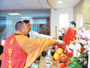 典禮由佛光山禪淨法堂禪修指導慧勤法師主法,安國寺監寺道祥法師帶領佛光會士林各分會近六十位會員共襄盛舉。慧勤法師表示,醫護人員是大醫王也是藥師佛,佛菩薩醫病患心靈,而醫生是醫病患的身體,佛堂啟用可以給人安定及心靈寄託,所以佛堂的啟用意義重大。(人間社記者李素芳攝)