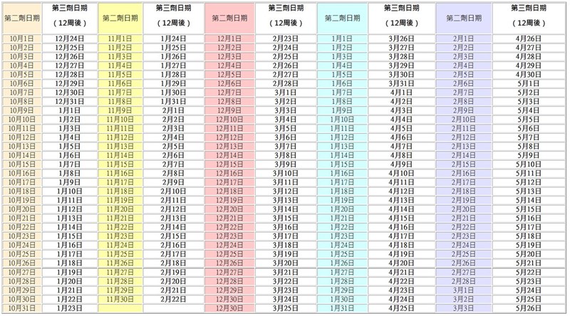 新冠疫苗第二劑隔12周後,可施打第三劑日期對照表