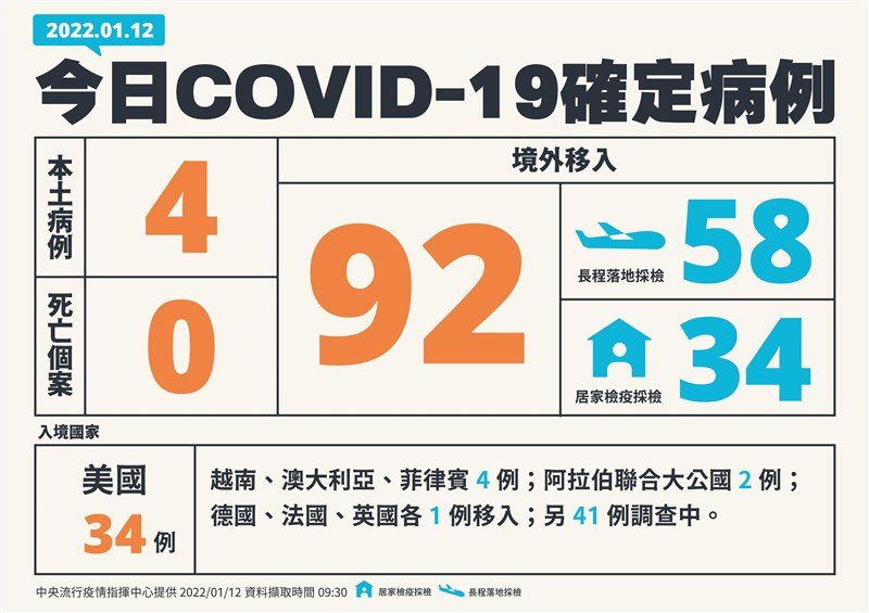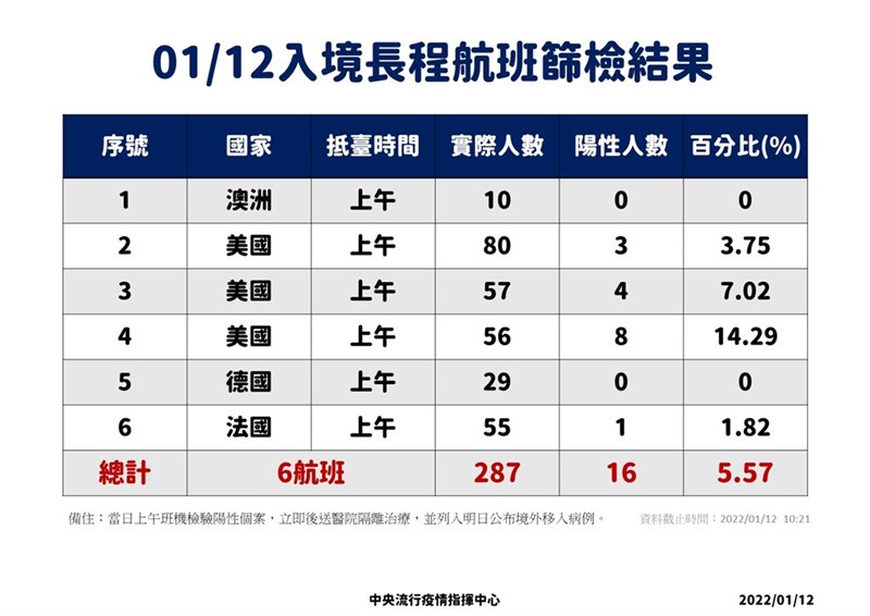 境外移入92例陽性率5.57% 58人機場採檢即送醫 |2022.01.12 語音朗讀 537觀看次 字級 大 中 小 指揮官陳時中表示,今天境外移入新增92例,其中58例是昨(1月11日)上午到半夜、共8個航班的採檢陽性者,在機場採檢即送醫。圖/陳嘉寧 【本報台北訊】中央流行疫情指揮中心今(12)日公布,新增4例本土個案及92例境外移入;另確診個案中無新增死亡。相較過往的境外移入表,今日起做更動,尤其在「境外移入」表格中,規畫出3種統計數據,分別是當日境外移入數、長程航班落地採檢數以及居家檢疫採檢數。指揮官陳時中表示,今天境外移入新增92例,其中58例是昨(1月11日)上午到半夜、共8個航班的採檢陽性者,昨天在機場採檢即送醫,另外34例是居家檢疫而採檢出陽性。圖/指揮中心昨起實施在機場先行篩檢分流後,陳時中表示,往後居家檢疫採檢陽性數字會慢慢降低,不過人數會有上下起伏,因在機場採唾液檢驗,返家等報告會需要一兩天時間,因此今天才有前天或大前天在居家檢疫的數據出爐。昨日境外落地採檢情況,陳時中說,昨天在機場實際採檢人數有625人,陽性58例,一整天下來陽性率為9.28%。至於今天落地採檢,上午有6個航班入境、採檢287人,共驗出16例陽性,人數比昨天稍微多一點,今上午6個航班的陽性率是5.57%。圖/指揮中心 前一篇文章 T1/頭一遭執行長被趕出場 聯盟隔3天做出回應 下一篇文章 專欄/走過歧視與質疑 美職誕生首位女教頭 熱門新聞 01法華禪寺深化宗教交流 拜會斯里蘭卡駐法大使2026.01.1602告急! 全台血庫剩5.3天 O型最缺2026.01.1603全球共讀《傳燈錄》 人間佛教雲端點燈2026.01.1604【生活快門】環保地球儀2026.01.1605【時光重逢】心裡有荷‧李蕭錕書畫照見初心2026.01.1606安心過年 海天佛剎送暖福田戶2026.01.1607大腦發炎易引發焦慮 吃莓果橄欖油助修復2026.01.1608舞獅躍動 馬德里佛青展現所學2026.01.1609【翻轉人生】修好機車 修好人生2026.01.1610【女子生活學】月亮忘記了2026.01.16 訂閱電子報 台北市 天氣預報 台灣一週天氣預報 相關報導 海鯤號再現身 海測前做準備汽車與農產品 美要求開放市場台美關稅談判 鄭麗君今說明周折汪喵嘉年華 總統籲零棄養高雄新材料循環產業園區台半導體供應鏈 4成移美