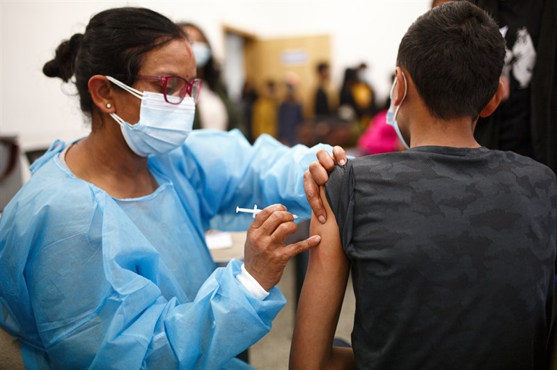 各國都在催打疫苗,圖為學生在尼泊爾加德滿都接種新冠疫苗。圖╱新華社
