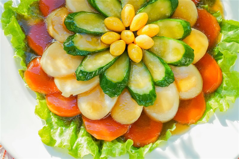 4、擺盤成圓形,順序先從紅蘿蔔開始,接著杏鮑菇、小黃瓜交錯擺上,中間放百果點綴,再淋上鍋內的湯汁,花開富貴即可上桌。