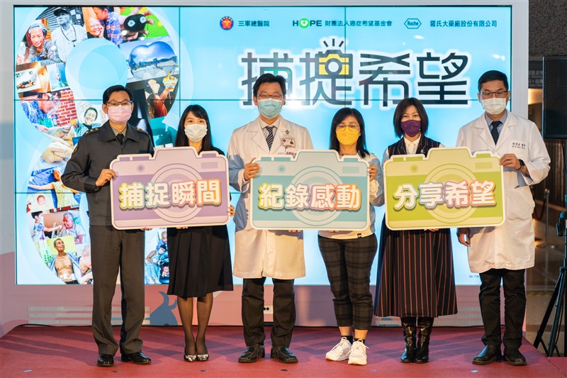 三軍總醫院、癌症希望基金會及羅氏大藥廠於12日舉辦第8屆「捕捉希望」展覽記者會,邀請癌症病友組第一名楊淑敏(右三)分享得獎照片背後的故事。圖/癌症希望基金會