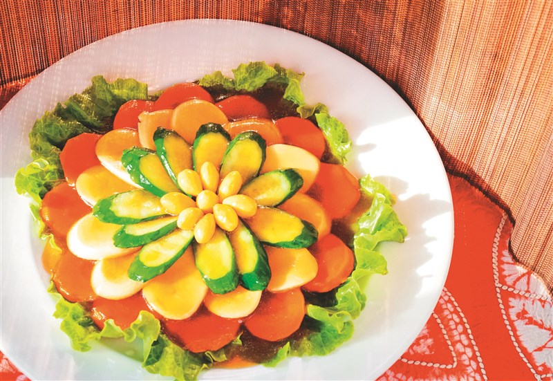 年菜「花開富貴」運用紅蘿蔔、杏鮑菇、小黃瓜和白果等食材,色香味俱全,象徵新的一年充滿富貴、吉祥、喜氣。圖/記者張穎容