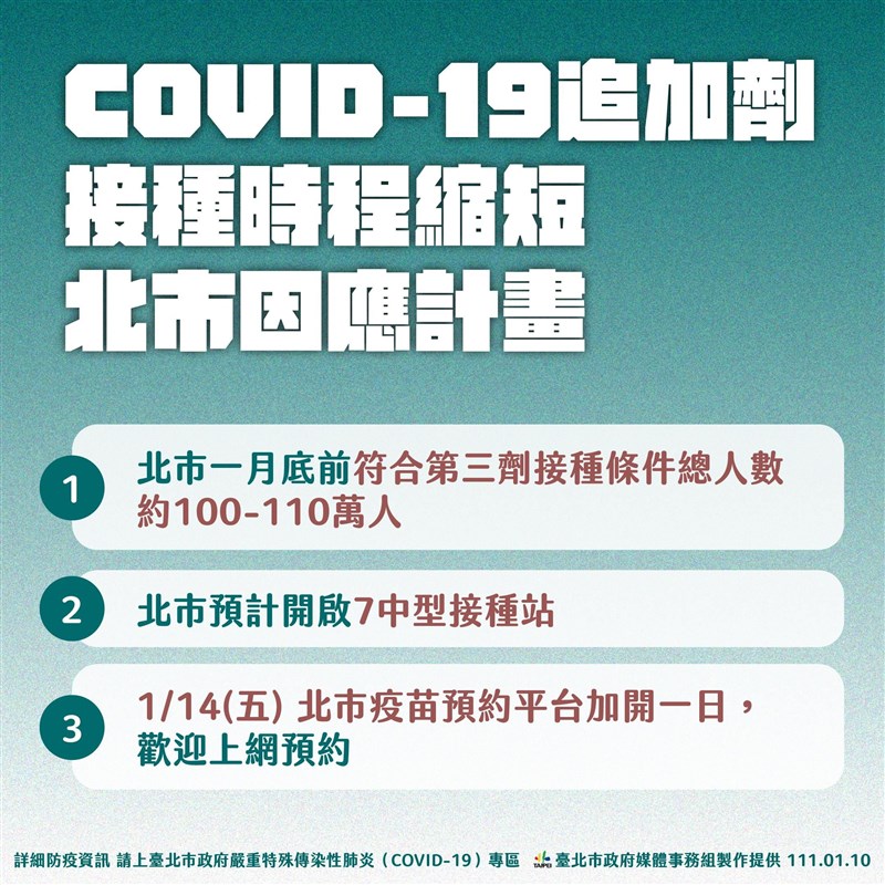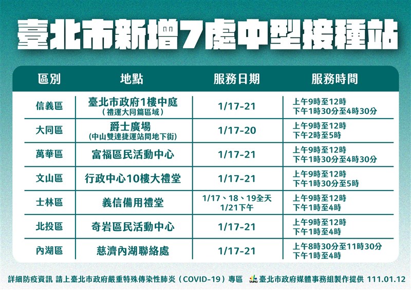 北市疫苗平台 開放今上午9時至下午5時預約 |2022.01.14 語音朗讀 742觀看次 字級 大 中 小 Omicron變種病毒升溫,新北市三重綜合體育館開設中大型疫苗接種站。圖╱中央社 【本報台北訊】北市疫苗預約平台今天(14日)再開放,並增加7個中型接種站,今天上午9時至下午5時可於北市疫苗預約平台登記,1月17日至23日接種。台北市長柯文哲呼籲,希望65歲以下民眾在中午12時以後再預約,好讓65歲以上長者優先接種。北市原開設11萬多劑量能,今天原本有7萬劑量能,但希望再增加7萬以上。市府表示,除約300家診所、醫院可接種外,北市特別增加7個中型接種站,分別為於信義區的市府一樓中庭,大同區爵士廣場,萬華區富福區民活動中心,文山區行政中心10樓大禮堂,士林區義信備用禮堂,北投區奇岩區民活動中心,及內湖區慈濟內湖聯絡處。圖╱北市府提供 前一篇文章 新聞千里眼 下一篇文章 6成患者輕忽甲狀腺疾病 遠離這癌你需要知道的事 熱門新聞 01瑕疵品反爆紅 哭哭馬賣到缺貨2026.01.1402台南林鳳營 落羽松花海2026.01.1303香港佛光道場 獲十大最高義工時數獎2026.01.1304日電鐵貴志站 任命第3代貓站長2026.01.1405平價版人類洗澡機 預計年底開賣2026.01.1406搶白金會員 男子12小時搭6次飛機2026.01.1307舞獅、樂器培訓 里斯本佛青傳承中華文化2026.01.1208靜電從哪來?2026.01.1209武士僧帽水母 現蹤2026.01.1210森林之巢 旅客住進樹梢2026.01.12 訂閱電子報 台北市 天氣預報 台灣一週天氣預報 相關報導 台半導體供應鏈 4成移美歷來最大手筆 台積今年資本支出 將逾500億美元台電技能競賽 1281名好手展技蔣經國逝世38周年 鄭麗文頭寮謁陵顧立雄:斷續收到墜海F-16黑盒子訊號搜救F-16飛官 海巡艦艇未發現油汙