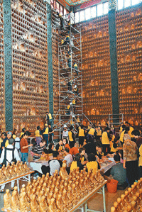 六百多位僧眾,昨天一早齊聚大雄寶殿,在心培和尚祈福、祝禱後展開洗佛。大眾熟練的各就各位,以人龍接力方式,將殿內一萬四千八百尊小佛像逐一迎請下來,有人擦拭佛龕、窗戶,有人幫忙換水、提水,六歲到八十多歲的義工菩薩和法師的臉上,都洋溢著虔誠喜悅。