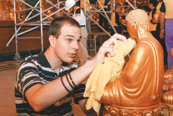 大佛城裡,信眾拿著撢子與毛筆,細細掃除佛像上的灰塵,戶外也有信眾拿著抹布、清水,清洗佛像身上塵埃,大眾認真專注的清洗;現場來了一支德國基督教參訪團,他們看著眾人洗佛,也樂得體驗洗佛,呈現另類宗教交流。