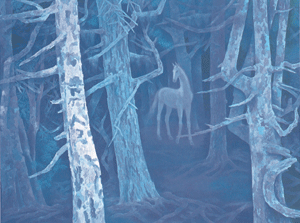 畫作「白馬的森林」,選用青與青紫色做為主調,全圖烘染著一股幽靜清寂的藍色氛圍,一種森林特有的幻夢與詩意之美,躍然紙上;也有一種像宗教無染的淨土聖城般祥和肅穆的奇妙暝想,劃過白樹溪澗,使人一接觸到東山的畫作,彷彿羽化登仙,飄飄然遺世而獨立,獨立於人間塵世之外,飄然於雲霄響遏處。