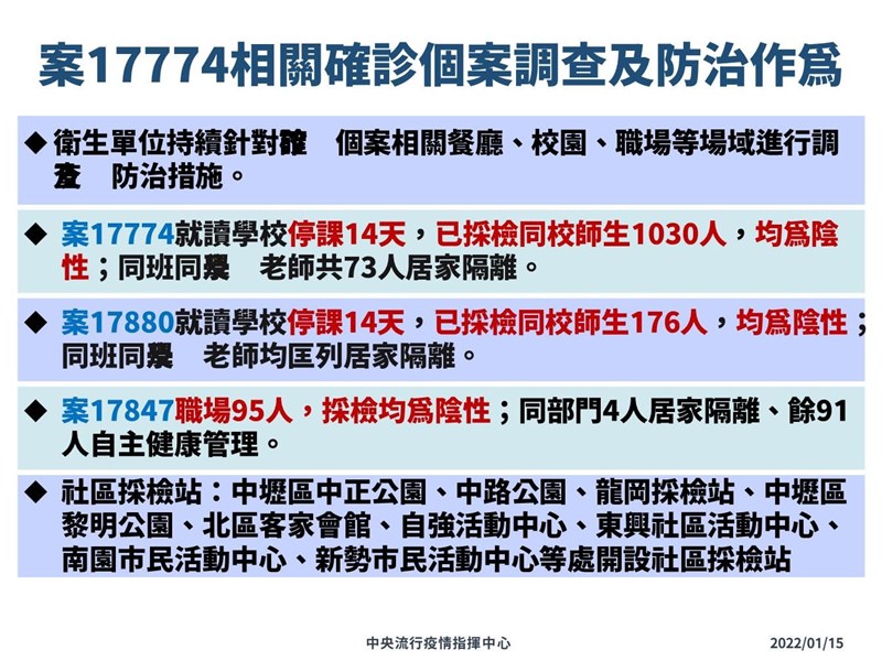 陳時中說,目前案17774學校停課14天,採檢1030名同校同學、老師等,同班同學有兩位陽性,案17880是17774的表妹,也被確診染疫,其就讀東興國中也是停課14天,採檢176人都陰性,同班同學及老師都居家隔離。