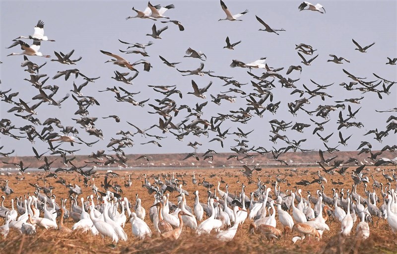 深冬時節,在位於江西省余幹縣康山墾殖場插旗洲分場的稻田裡,成千上萬隻候鳥十一日歡快地嬉戲覓食,牠們時而追逐打鬧,時而振翅飛翔,享受著鄱陽湖畔的冬日暖陽。從「人鳥爭食」到「為鳥留食」,亞洲最大的越冬候鳥棲息地——鄱陽湖,已成為越冬候鳥在中國大陸的美好家園。圖/新華社