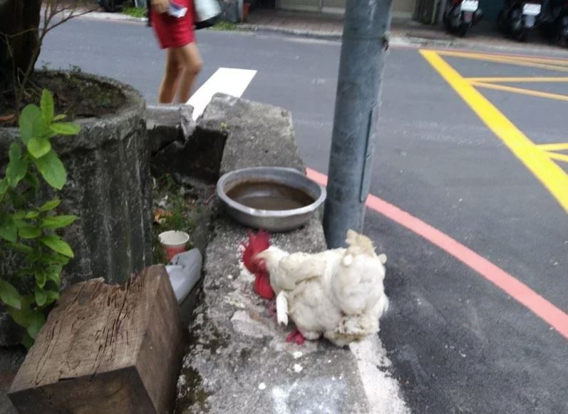 殯葬業者將俗稱「帶路鴨」的祭祀雞鴨做完法事後,隨意扔至館內牆角,新北首開罰3萬。圖為遭遺棄在路邊的帶路雞。圖/新北市動保處提供