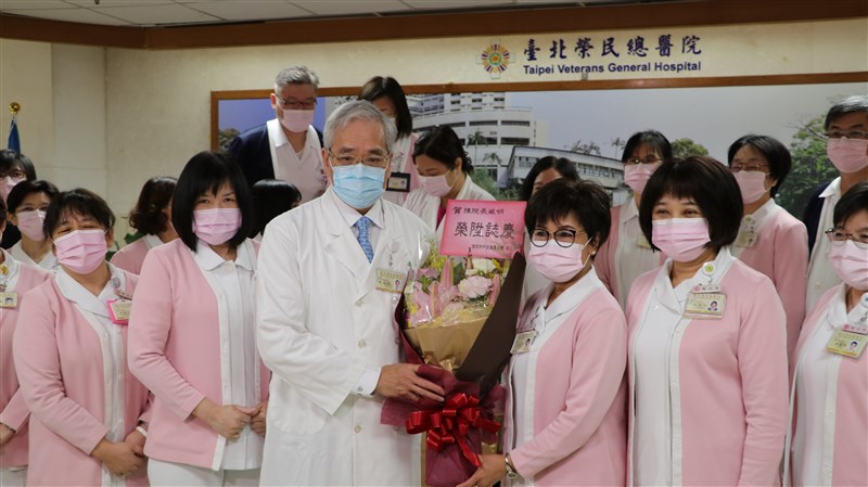 陳威明接任北榮院長,護理部主任明金蓮(右3)帶領同仁獻花祝福。圖/台北榮總