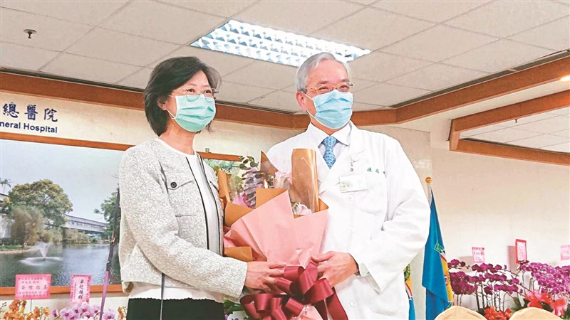 台北榮總昨日舉行新任院長布達典禮,由國內骨癌權威陳威明(右)接任院長,陳威明妻子(左)也親自到場見證丈夫榮耀時刻。圖/中央社
