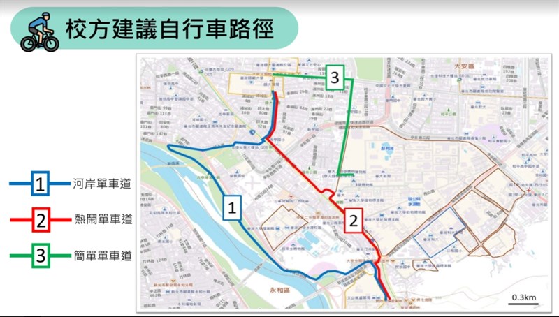 由於騎單車在人行道上常遇到人車爭道的問題,在大馬路上騎單車又險象環生,為了讓3校師生通學更安全,並朝低碳環保、綠色都市邁進,台師大初步規劃於3校間設置特色單車道,串連沿線自然與人文景點,讓大學生騎單車跨校上課時,能享受環保又安全的通學路。