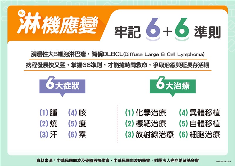中華民國血液及骨髓移植學會理事長暨台大癌醫中心分院血液腫瘤部主任柯博升指出,瀰漫性大B細胞淋巴瘤症狀可以不典型,與老化、疲勞症狀相似,患者容易錯失黃金治療期,高達半數患者確診時已屬晚期。提醒民眾,一旦莫名出現「淋巴結腫脹、發燒超過38℃且持續2周以上、夜間盜汗、久咳不癒超過1個月、6個月內體重減輕10%以上、疲累感愈來愈嚴重」6大症狀(見下圖),就應該及時就醫,依照醫囑,進行相關檢查。