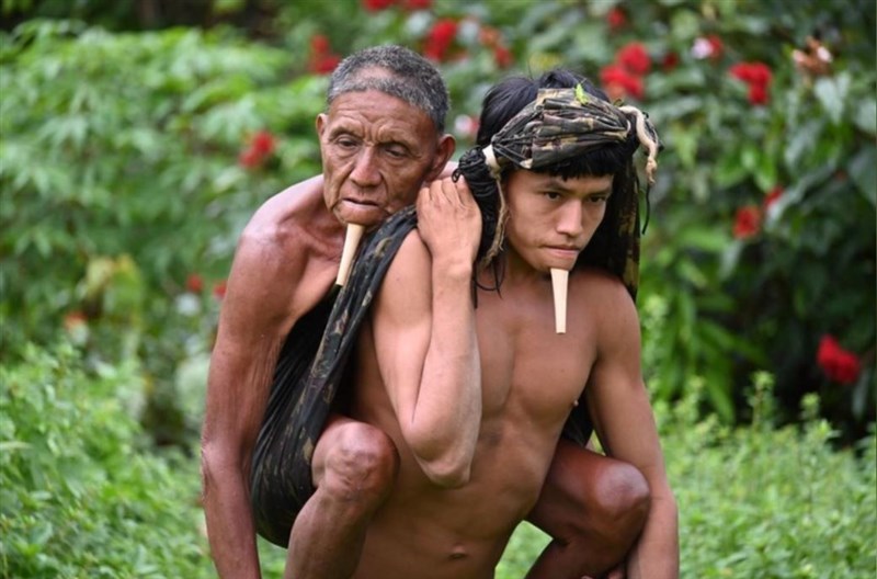 一位亞馬遜原住民背著父親,穿越雨林來回徒步12小時,就為了帶爸爸打疫苗。圖/擷自印度快報