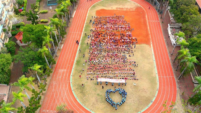 上千名學生共同在操場、排列出氣勢磅礡的巨大「虎」字圖騰,為即將到來的新春祈福。圖/北區區公所提供