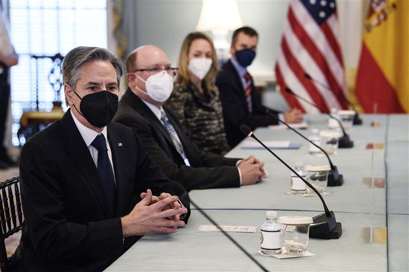 美國國務卿布林肯18日於國務院,會見西班牙外長。圖╱美聯社