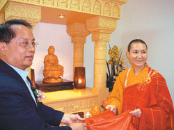 【人間社記者妙智、道昀宜蘭報導】宗教不分派別,羅東聖母醫院十一日舉行安寧病房啟用,除了耶穌神像揭幕,佛光山也捐了佛龕與佛像,天主與佛祖共同庇佑癌末病人與家屬。(滿禎法師與高國卿神父共同為佛堂揭布啟用 人間社記者道昀攝)