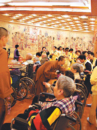 台北普門寺友愛服務隊,九日帶領仁仁養護所十九位以輪椅代步的長者至台北道場、佛光緣美術館台北館參觀,久未出門的長者,在近四十位佛光人的細心服務下,開懷的心情全寫在臉上,有長者直說:「 哇!好像去天堂一樣。」