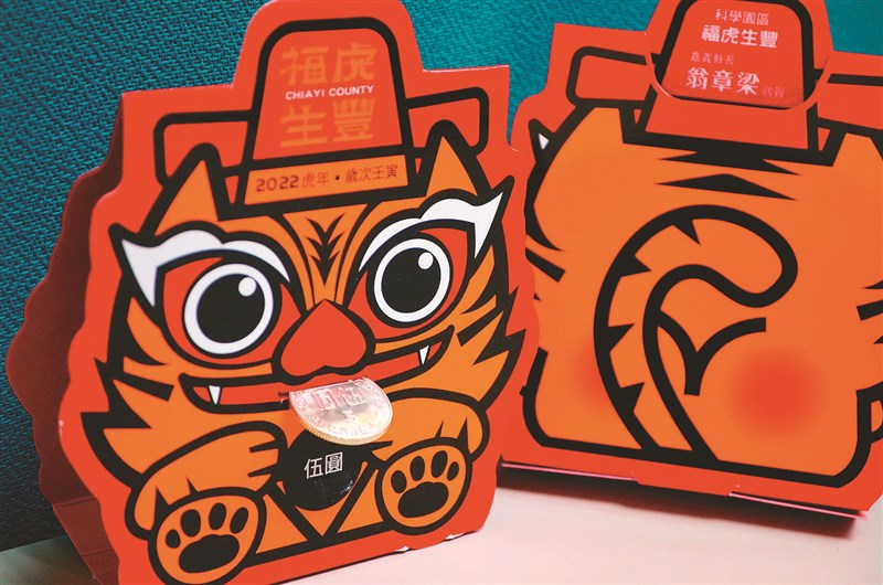 此外,嘉義縣二○二二年虎年立體紅包鑲有象徵「有緣」的五元,設計精巧,還可以將五元拿下來讓小老虎咬錢討吉利,希望大家財源廣進好運旺旺來。