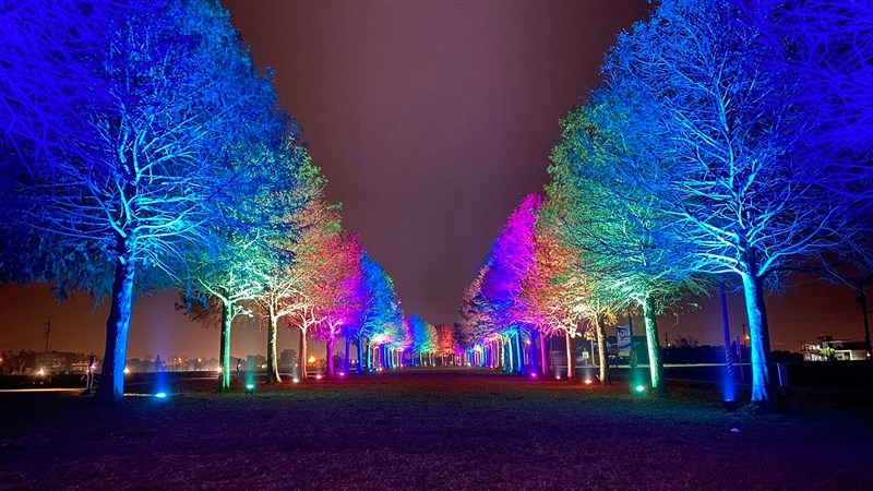 宜蘭縣三星鄉公所20日表示,安農溪落羽松祕境即日起到2月20日,有夜間聲光布置製造浪漫氛圍。圖/宜蘭縣三星鄉公所提供