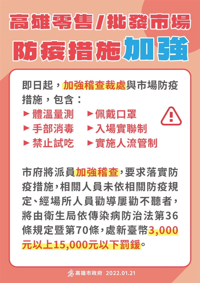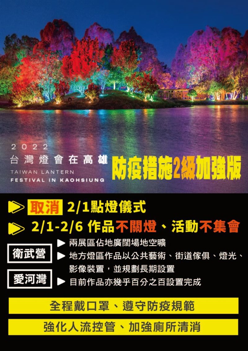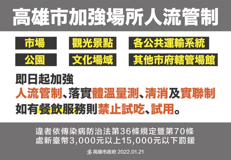 高雄強化防疫取消點燈集會 多場所實施人流管制 |2022.01.21 語音朗讀 1215觀看次 字級 大 中 小 高雄市長陳其邁宣布,實施防疫措施二級加強版,包括加強場所人流管制,並取消台灣燈會2月1日點燈集會。圖/高雄市政府 【本報高雄訊】高雄市新增10例新冠本土確診案例,市長陳其邁宣布,高雄實施防疫措施二級加強版,包括加強場所人流管制,取消運動賽事開閉幕式等,並取消台灣燈會2月1日點燈集會。陳其邁下午在防疫記者會上宣布,因應新冠疫情,高雄市實施二級加強版防疫措施,包括公車、捷運、輕軌、計程車、渡輪全面戴口罩、車輛或船隻清消、實聯制,Youbike加強場站、把手、座墊、車機等清消。此外,高雄市加強場所人流管制,包含市場、公園、觀光景點、文化場域、公共運輸系統、其他市府轄管場館,即日起加強人流管制、落實體溫量測、清消及實聯制,如有餐飲服務則禁止試吃、試用。圖/高雄市政府運動賽事部分,不集會、取消開閉幕式、場地人流管制、量體溫、實聯制、選手出示2劑疫苗接種小黃卡或3日內PCR證明。除下場比賽選手下場比賽期間,其餘一律全程戴口罩、禁止飲食(喝水除外,喝完立刻戴口罩),違反者取消參賽資格。陳其邁指出,市府也將派員加強稽查零售、批發市場,要求落實防疫措施。令市府四維、鳳山行政中心維持聯合洽公,文書交換中心採分流方式進行文書交換。圖/高雄市政府另前鎮漁民服務中心、興達港、漁夫市集、蚵仔寮魚貨直銷中心、漁會門市、魚市場等,實聯制、量體溫、容留人數降載外,不提供試吃、魚貨停止叫賣。至於台灣燈會,陳其邁說,衛武營、愛河灣2主場本來就以分散式設計,目前也已經陸續點燈,原定2月1日的點燈活動不舉行集會,但是作品也不關燈;至於原定2月15日交通部主燈點燈活動,將視疫情情況調整,並要求民眾全程戴口罩、遵守防疫規範,強化人流控管、加強廁所清消。圖/高雄市政府 前一篇文章 英國女王找兼職管家 只開最低時薪 下一篇文章 隙頂河津櫻盛開 象山添傳奇 熱門新聞 01法華禪寺深化宗教交流 拜會斯里蘭卡駐法大使2026.01.1602告急! 全台血庫剩5.3天 O型最缺2026.01.1603全球共讀《傳燈錄》 人間佛教雲端點燈2026.01.1604【生活快門】環保地球儀2026.01.1605【時光重逢】心裡有荷‧李蕭錕書畫照見初心2026.01.1606安心過年 海天佛剎送暖福田戶2026.01.1607大腦發炎易引發焦慮 吃莓果橄欖油助修復2026.01.1608舞獅躍動 馬德里佛青展現所學2026.01.1609【翻轉人生】修好機車 修好人生2026.01.1610【女子生活學】月亮忘記了2026.01.16 訂閱電子報 台北市 天氣預報 台灣一週天氣預報 相關報導 超人力霸王提燈亮相農業部:營建餘土 不得回填農地金陵花海吸睛土豆鳥普查 雲林數量冠全台陽明山櫻花巷 美不勝收屏東騎單車賞美景