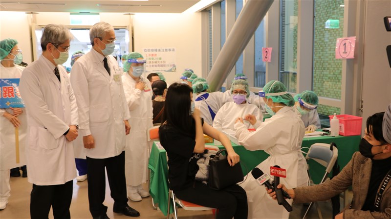 陳威明院長(左二) 侯明志副院長(左一)視察接種現場。圖/台北榮總
