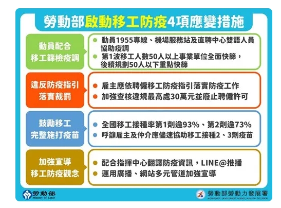 第四點,勞動部將加強宣導移工防疫觀念,勞動部先前已將疫情資訊翻譯成英語、泰語、印尼語及越南語,透過勞動部所建置的「LINE@移點通」進行推播,相關防疫資訊亦同步置於多國語跨國勞動力權益維護資訊網站。