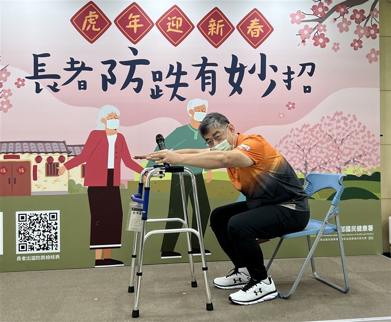 康寧醫院急診科醫師郭健中示範提醒,長者外出應攜帶合適的輔具與配件,如枴杖或助行器等行動輔具,材質勿太重、避免移動不便。圖/國健署