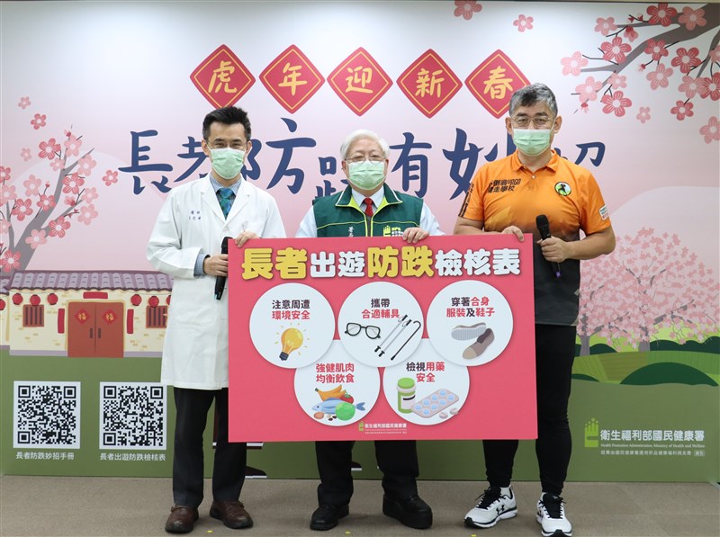 馬偕醫院急診醫學部主任簡定國表示,長者因跌倒送醫的常見受傷部位為頭部撕裂傷、胸部挫傷及骨折(手腕、髖部)等。因此,提醒民眾出遊時,須考量長輩的健康狀況,適時安排定點休息,避免長者發生跌倒的事故。另,康寧醫院急診科醫師郭健中提醒,行動能力是影響老年生活品質的重要因素,應強健肌肉和身體平衡,提高跌倒時的自我防衛力。出遊時,可善用手杖或登山杖,並避開積水處、陡坡、雜草叢及碎石處,避免跌倒風險。