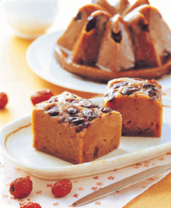 {3} 取玻璃紙,刷上油,置模型內,塗上油,將混合好的糊料舀入模中,用蒸籠熱水煮滾後才放入,用中小火蒸1.5~2小時。