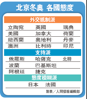【本報綜合報導】北京冬奧於2月4日至20日舉行,除了仍擺脫不了新冠疫情陰影,北京還面臨多國以外交手段抵制的壓力。美、英、加拿大和澳洲等多國陸續表態,不會派政府代表出席,理由是擔憂中國人權紀錄;但中國堅定盟友如俄羅斯、波蘭、哈薩克等國,則選擇力挺北京。