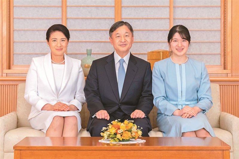 日本現行皇室典範是規定,皇位由皇統男性繼承,如今日皇德仁膝下僅有一女愛子(右)。圖為德仁全家福。圖/美聯社