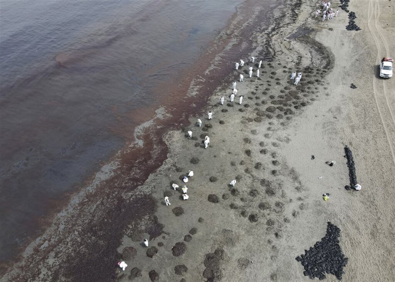 秘魯發生漏油事件,穿著保護裝備的工作人員在海灘清理油汙。圖/美聯社。