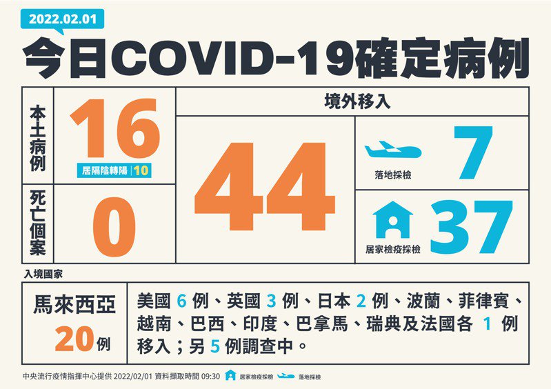 指揮中心說明,今日新增境外移入個案為33例男性、11例女性,年齡介於未滿5歲至50多歲,分別自馬來西亞(20例)、美國(6例)、英國(3例)、日本(2例)、波蘭、菲律賓、越南、巴西、印度、巴拿馬、瑞典及法國(各1例)移入;另5例調查中。入境日介於今年1月17日至1月31日。