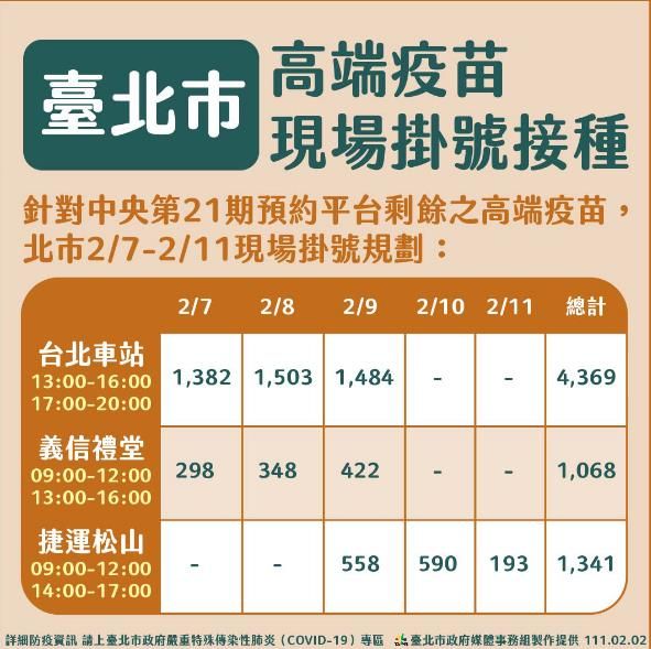 第3劑別再錯過 北市預約平台開放預約 |2022.02.04 語音朗讀 1441觀看次 字級 大 中 小 大年初二,新北民眾在機動接種站打疫苗。圖╱中央社 【本報台北訊】為了加速民眾第三劑疫苗施打,台北市今天(4日)上午9時開始,加開「台北市疫苗預約系統」提供BNT疫苗追加劑6萬8387劑,2月4、5日9時至17時開放民眾預約,6日發送簡訊通知,7至9日接種疫苗;另外,台北市2月7至11日也加開高端疫苗現場掛號接種,於3處中型接種站共提供6778劑。北市府表示,今天台北市預約平台重啟預約,提供BNT疫苗施打,提醒不要一直堅持要打莫德納,莫德納與BNT皆為mRNA疫苗,兩者抗體效價無明顯差異,不需「非莫不可」有得打就好。台北市今明二天,加開「台北市疫苗預約系統」提供BNT疫苗追加劑,開放民眾預約。圖╱北市府提供柯文哲年初二受訪時提到,他就是打BNT疫苗,隨著疫苗覆蓋率高才會慢慢解封,台灣不可能永遠鎖國,但疫苗覆蓋率不夠還是危險,台北市甚至有10%的人,連一劑都沒打。北市衛生局表示,由於BNT疫苗剩餘超過8萬個名額,扣除醫院掛號系統預約量,北市衛生局於春節期間初四、初五加碼開放台北市「新冠肺炎COVID-19疫苗接種登記系統」,只要滿18歲以上、2021年11月15日前完成第2劑疫苗接種者,即可預約接種。另外,衛生局於2月7至11日開放台北車站、義信禮堂及捷運松山站等3處中型接種站,提供高端疫苗現場掛號共6778個名額,3處接種站服務日期及時間不同,請民眾留意接種時段,避免撲空。台北市2月7至11日也加開高端疫苗現場掛號接種,於3處中型接種站共提供6778劑。圖╱北市府提供 前一篇文章 星雲大師:捨得 下一篇文章 取物流包裹會感染? 醫:拆封後3動作是關鍵 熱門新聞 01記得與忘記2026.01.0802悍將、雄鷹補戰力 拚闖季後賽2026.01.0903南投山區 梅花盛開2026.01.0704運動後分泌的肌肉激素是萬能荷爾蒙2026.01.1005台水潮州營運所落成 佛光山灑淨2026.01.0906全球最長壽貓 30歲等同120歲人瑞2026.01.0807星雲大師全集【傳記】百年佛緣─生活篇 僧情不比俗情濃—我對感情的看法 4-22026.01.0708社論--老宅延壽與老屋安住2026.01.1009三寶寺護法委員餐會 凝聚長期護持力量2026.01.0710南二監佛堂落成 佛光山灑淨祈福2026.01.10 訂閱電子報 台北市 天氣預報 台灣一週天氣預報 相關報導 顧立雄:斷續收到墜海F-16黑盒子訊號搜救F-16飛官 海巡艦艇未發現油汙社宅跳票 擬助37.5萬空屋出租中捷橘線延伸海線 有譜F-16防撞系統列標配 明年全數安裝租屋、外食壓力未減 終結高通膨 去年CPI年增1.66%