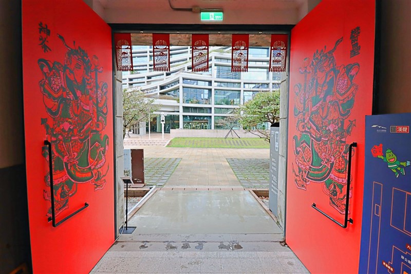 製菸工廠三號入口大門則是〈祈福顧厝〉展區,展示傳說中最早的門神–神荼及鬱壘。圖/松山文創園區提供展覽共分為7個展區分布在園區各處,分別為〈虎虎生風〉、〈吉祥平安〉、〈大過虎年〉、〈生肖賀喜〉、〈虎虎哈嘻〉、〈祈福顧厝〉及〈六寶嬉春〉,每件展品都有其代表的祝福意義。在文創大街展出的〈虎虎生風〉,特別展出六幅大型剪紙虎作品,每幅超過200公分,展現老虎雄赳氣昂的氣勢,包括母子虎、大小虎,還有兩幅團花對虎,展現春節闔家歡樂的氣氛。