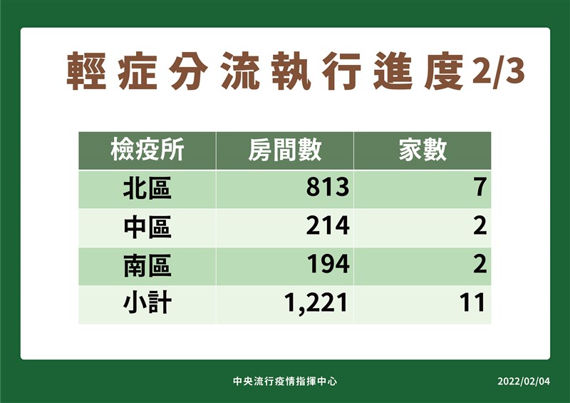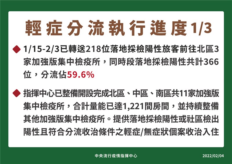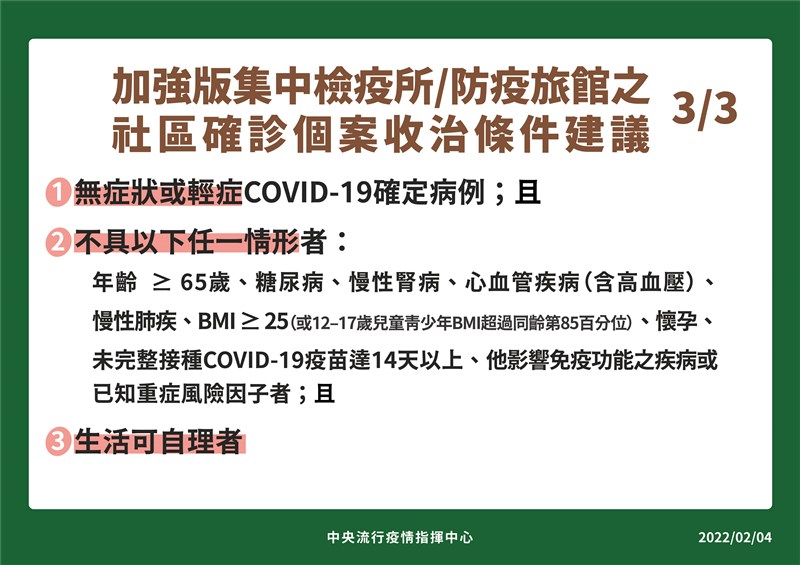 輕症分流 北中南加開集檢所1200多間 |2022.02.04 語音朗讀 1732觀看次 字級 大 中 小 北市劍潭活動中心成防疫專責旅館,收治輕症者。圖╱資料照片 【本報台北訊】北、中、南地區已加速加開集中檢疫所量能,因應輕症分流。中央疫情指揮中心醫療應變組副組長羅一鈞指出,收治者需要符合3個條件,包含無症狀跟輕症、排除慢性病心臟病或超過65歲年長者,最後就是需要生活自理者,才可收治到加強版集中檢疫所。羅一鈞說,根據1月15日至2月3日已轉送218位落地探檢陽性旅客,前往北區3家加強版集中檢疫所,同時段落地採檢陽性共計366位,分流占59.6%。指揮中心已整備開設完成北區、中區、南區共11家加強版集中檢疫所,合計量能已達1221間房間,並持續整備其他加強版集中檢疫所,後續提供落地採檢陽性或社區檢出陽性且符合分流收治條件的輕症或無症狀個案收治。圖/指揮中心提供 前一篇文章 星雲大師:捨得 下一篇文章 亞洲杯女足傳壞消息 對泰國一戰7主力缺陣 熱門新聞 01記得與忘記2026.01.0802悍將、雄鷹補戰力 拚闖季後賽2026.01.0903運動後分泌的肌肉激素是萬能荷爾蒙2026.01.1004台水潮州營運所落成 佛光山灑淨2026.01.0905全球最長壽貓 30歲等同120歲人瑞2026.01.0806社論--老宅延壽與老屋安住2026.01.1007南二監佛堂落成 佛光山灑淨祈福2026.01.1008【斗室有燈】斷肘書法家的故事2026.01.0909【詩】爆紅2026.01.1210佛光兒童奉茶 法水寺暖人心2026.01.09 訂閱電子報 台北市 天氣預報 台灣一週天氣預報 相關報導 顧立雄:斷續收到墜海F-16黑盒子訊號搜救F-16飛官 海巡艦艇未發現油汙社宅跳票 擬助37.5萬空屋出租中捷橘線延伸海線 有譜F-16防撞系統列標配 明年全數安裝租屋、外食壓力未減 終結高通膨 去年CPI年增1.66%