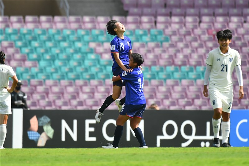 蘇育萱(上)單場梅開二度,是中華女足能擊敗泰國的大功臣。圖/足協提供