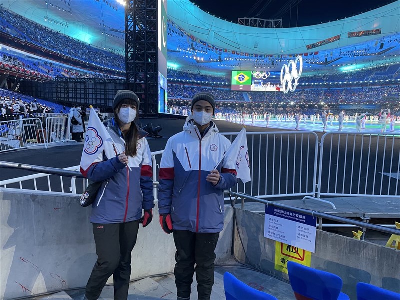 我國由滑雪男子選手何秉睿與競速滑冰女將黃郁婷擔任冬奧開幕式掌旗官。圖/奧會提供
