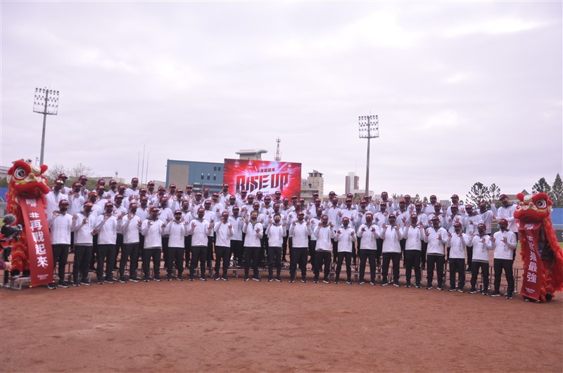 猿隊在嘉義縣棒球場舉辦開季典禮,喊出新口號「RISE UP #再戰起來」,期待導入日式球風後能幫助球隊戰績成長。圖/記者張哲郢